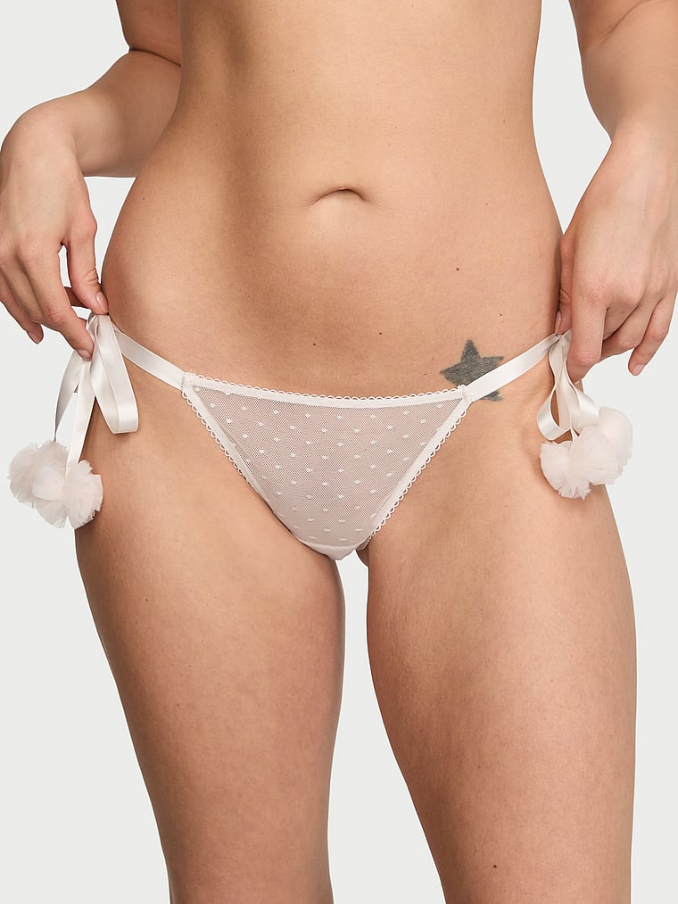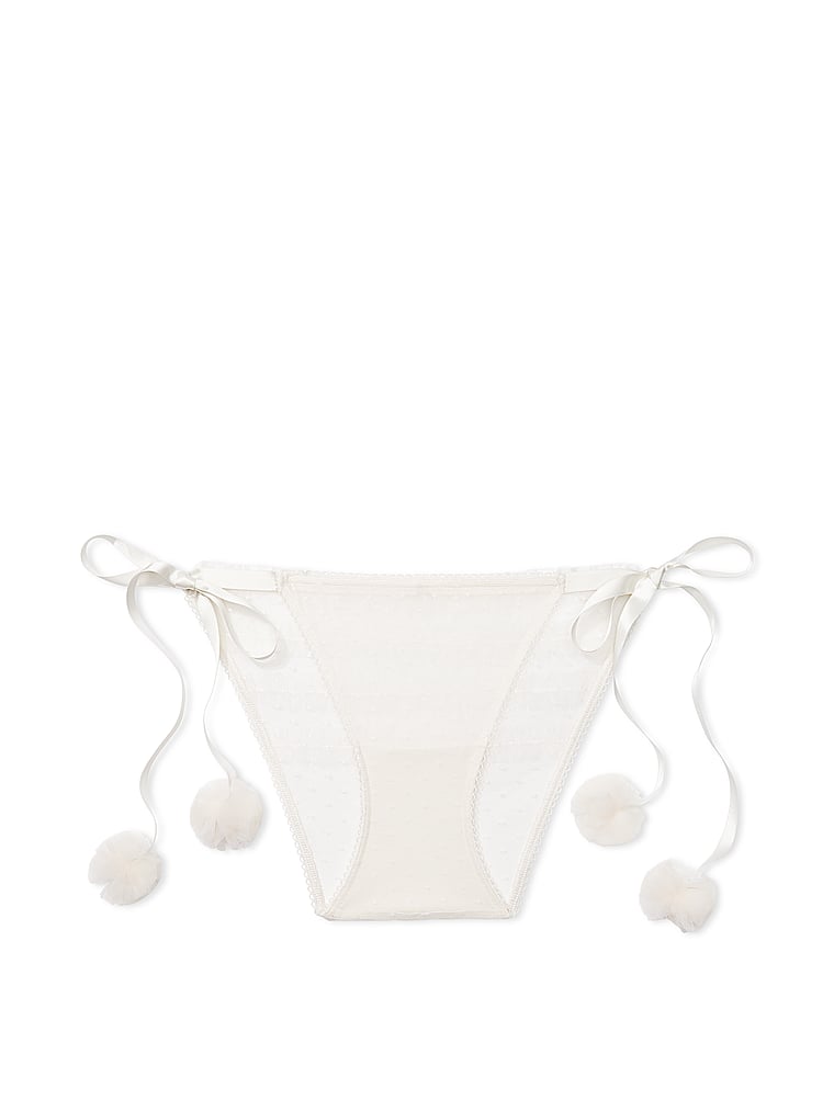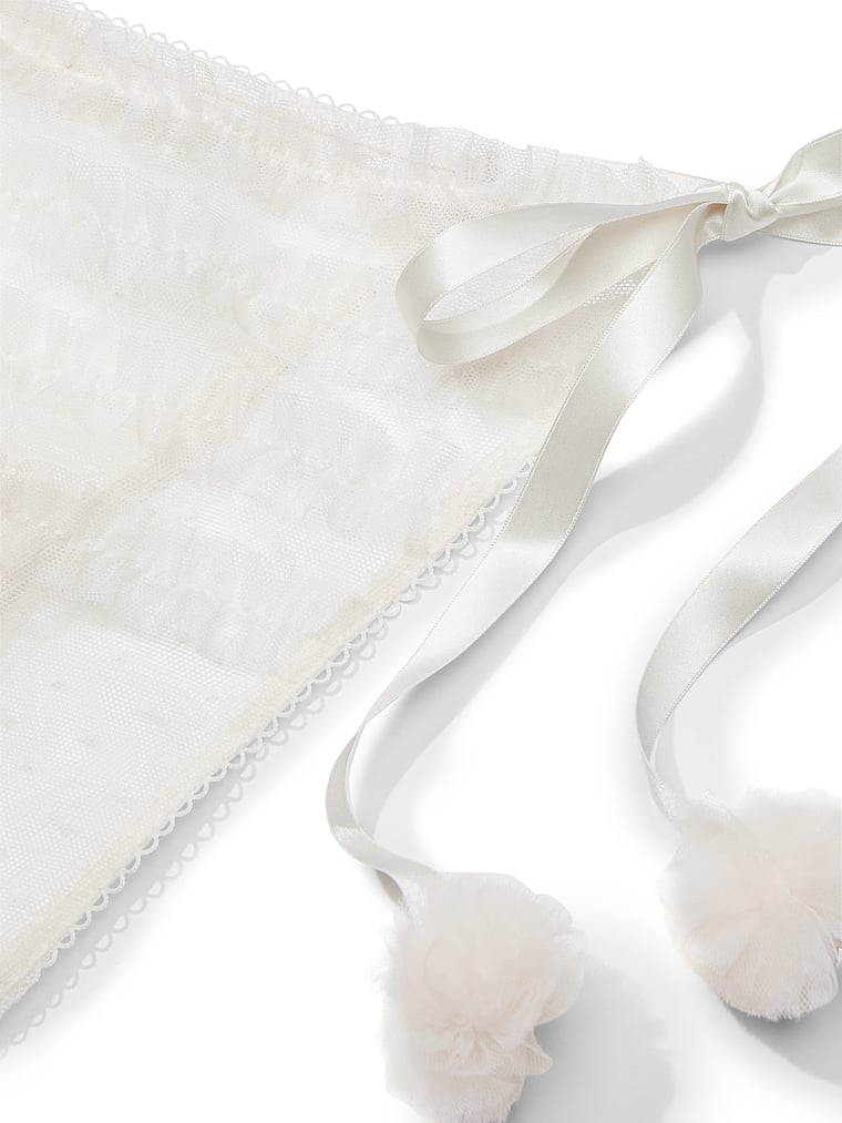 Add some flirty touches to your aisle style with this sheer pair, featuring tulle ruffles in back and satiny side ties with fluffy poms.