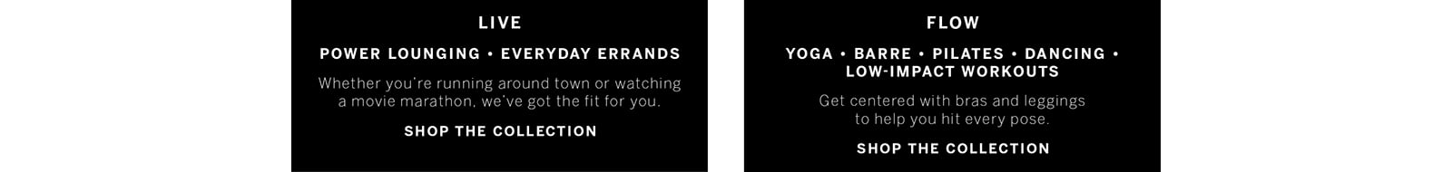Live. Power Lounging - Everyday Errands. Whether you are running around town or watching a movie marathon, we have got the fit for you. Shop the collection.Flow. Yoga - Barre - Pilates - Dancing - Low-Impact workouts. Get centered with bras and leggings to help you hit every pose. Shop the collection.