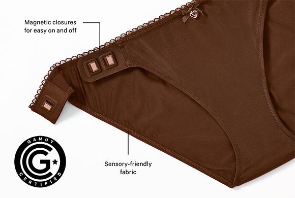 Featuring Bras and Panties that offer magnetic closures for easy on and off, front strap adjustors, and sensory-friendly fabric, and just the right amount of coverage. Available in bands 32–42, cups A-DDD, and sizes XS-XXL.