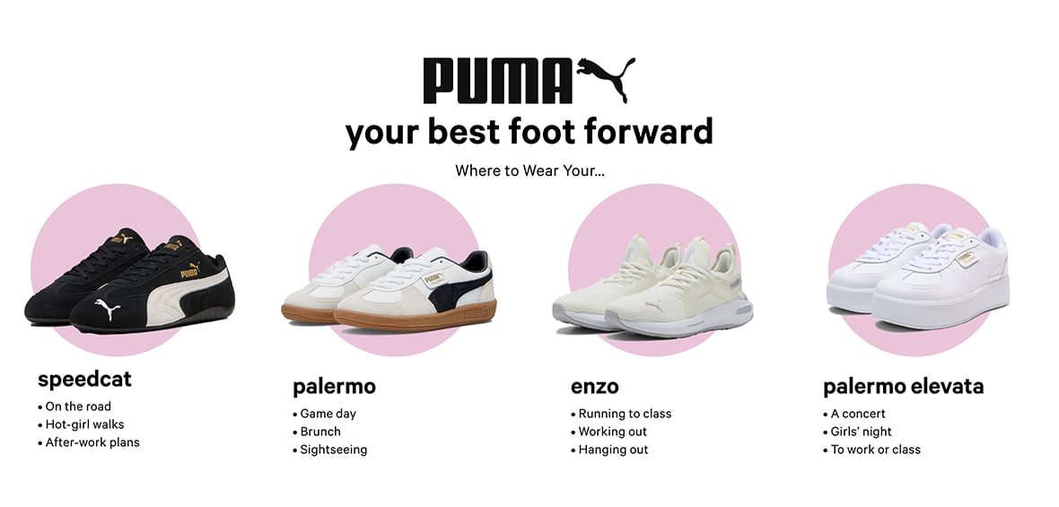 Your Best Foot Forward. Where to Wear Your…Your Best Foot Forward. Where to Wear Your. Speedcat. On the road. Hot-girl walks. After-work plans.Your Best Foot Forward. Where to Wear Your. Palermo. Game day. Brunch. Sightseeing.Your Best Foot Forward. Where to Wear Your. Enzo. Running to class. Working out. Hanging out.Your Best Foot Forward. Where to Wear Your. Palermo Elevata. A concert. Girls night. To work or class.