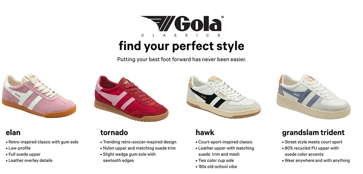 Gola Classics. Find Your Perfect Style. Putting your best foot forward has never been easier.Elan. Retro-inspired classic with gum sole. Low-profile. Full suede upper. Leather overlay details.Tornado. Trending retro-soccer-inspired design. Nylon upper and matching suede trim. Slight wedge gum sole with sawtooth edges.Hawk. Court-sport-inspired classic. Leather upper with matching suede trim and mesh. Two color cup sole. 80s old-school vibe.Grandslam Trident. Street style meets court sport. 80% recycled PU upper with suede color accents. Wear anywhere and with anything.