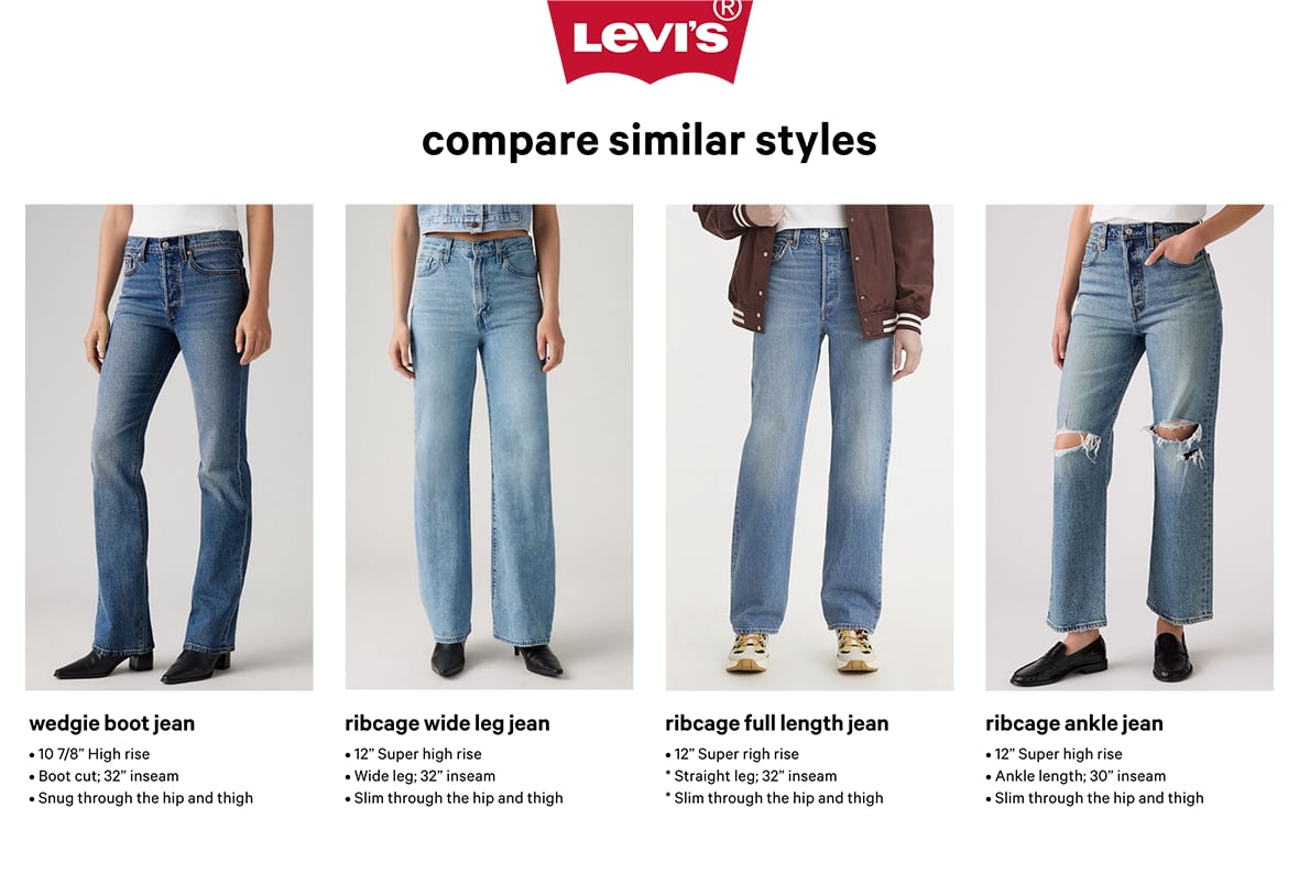 Levis. Compare Similar Styles.Wedgie Boot Jean. 10 7/8 High rise. Boot cut 32 inseam. Snug through the hip and thighRibcage Wide Leg Jean. 12 Super high rise. Wide leg 32 inseam. Slim through the hip and thigh.Ribcage Full Length Jean. 12 Super righ rise. Straight leg 32 inseam. Slim through the hip and thighRibcage Ankle Jean. 12 Super high rise. Ankle length 30 inseam. Slim through the hip and thigh