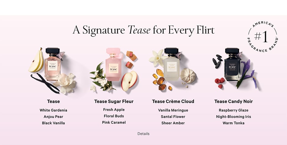 A Signature Tease for Every Flirt. TEASE. White Gardenia. Anjou Pear. Black VanillaA Signature Tease for Every Flirt. TEASE SUGAR FLEUR. Fresh Apple. Floral Buds. Pink Caramel.A Signature Tease for Every Flirt. TEASE CREME CLOUD. Vanilla Meringue. Santal Flower. Sheer AmberA Signature Tease for Every Flirt. TEASE CANDY NOIR. Raspberry Glaze. Night-Blooming Iris. Warm Tonka.