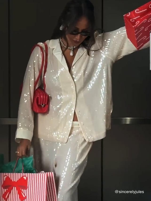 Shimmery and luxurious, this celebratory Set takes Pajama dressing to an extra-glam level. Allover sequins and satin details elevate this ensemble to party-ready. It's our answer to "What are you w...